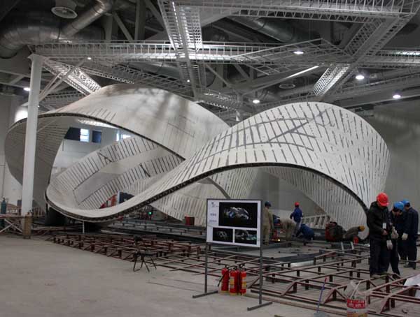 世博會湖南館取名為“桃花源里·Xanadu”;,Xanadu英文意為“世外桃源”,是西方世界描述神秘仙境為廣泛使用的詞匯。湖南館展示的主題則是“都市桃花源”。展館外觀之所以采用雙“魔比思環(huán)”相扣的造型,是因取義無窮大符號“∞”和中國太極,這與和諧自然的中國理想城市意境以及長株潭城市群“兩型社會”的理念相契合。